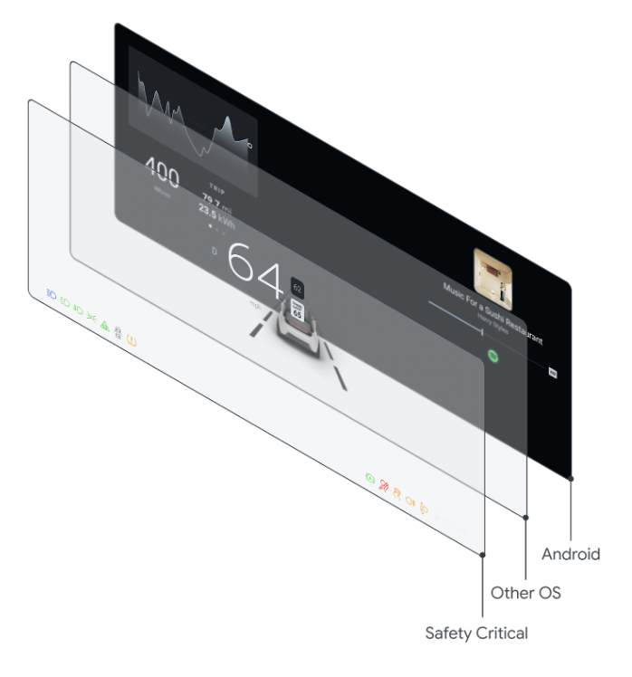 Trong các cấu hình thiết bị Automotive, nơi các thành phần quan trọng về an toàn được kết xuất trong cùng một khu vực trên màn hình như Android Automotive, bắt buộc các lớp Android phải nằm sau các lớp quy định. Mặc dù có thể có các vùng trong suốt trong Android, nhưng tính năng này không được hỗ trợ chính thức và không thể dựa vào. Các hoạt động triển khai thiết bị ô tô KHÔNG ĐƯỢC xếp lớp Android Automotive OS lên trên bất kỳ thành phần nào liên quan đến an toàn hoặc quy định.
