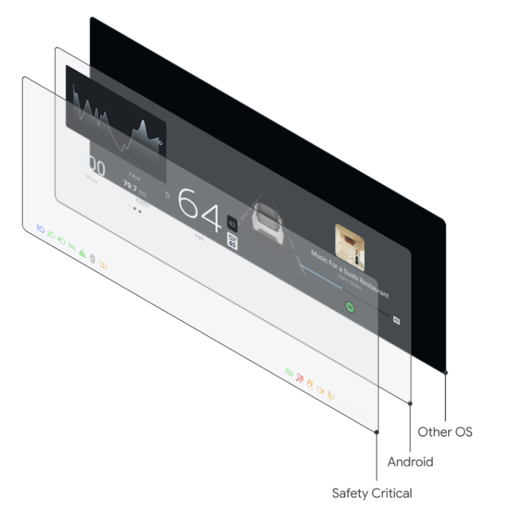 স্বয়ংচালিত ডিভাইস কনফিগারেশনে যেখানে নিরাপত্তা-গুরুত্বপূর্ণ উপাদানগুলি স্ক্রীনের একই এলাকায় Android Automotive হিসাবে রেন্ডার করা হয়, এটি অপরিহার্য যে Android স্তরগুলি নিয়ন্ত্রক স্তরগুলির পিছনে থাকে৷ যদিও অ্যান্ড্রয়েডে স্বচ্ছ অঞ্চলগুলি থাকা সম্ভব, এটি আনুষ্ঠানিকভাবে সমর্থিত নয় এবং এর উপর নির্ভর করা যায় না । স্বয়ংচালিত ডিভাইস বাস্তবায়নের জন্য Android Automotive OS-কে কোনো নিরাপত্তা প্রাসঙ্গিক বা নিয়ন্ত্রক উপাদানের উপরে লেয়ার করা উচিত নয়।
