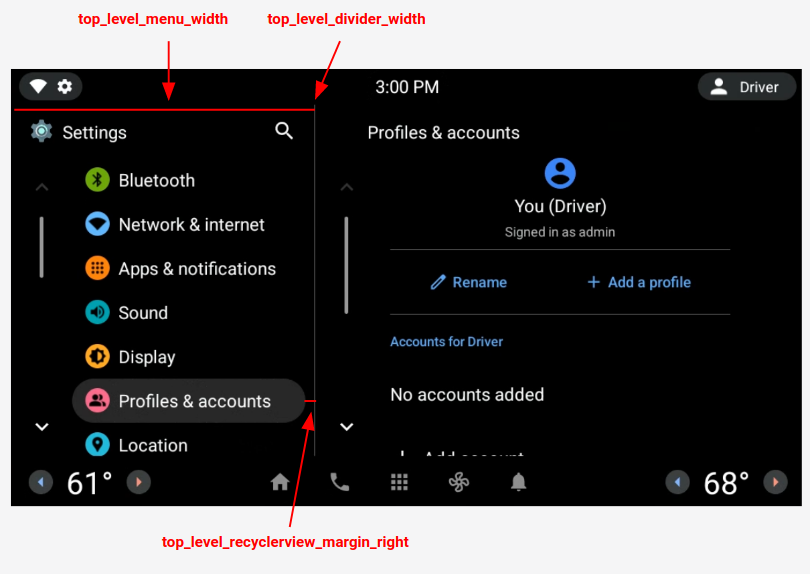Secara default, CarSettings kini menampilkan tampilan panel ganda saat lebar jendela aplikasi lebih besar dari atau sama dengan 1400 dp, dan tampilan panel tunggal jika tidak. Untuk menyesuaikan hal ini untuk perangkat tertentu, gunakan overlay resource runtime (RRO) untuk menargetkan nilai konfigurasi yang diperlukan: