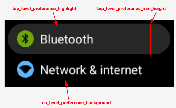 Preferensi tingkat teratas adalah CarUiPreferences kustom dengan tata letak yang sedikit diubah untuk mengubah tinggi preferensi dan bentuk latar belakang. Ada banyak cara untuk menyesuaikan tampilan preferensi ini: