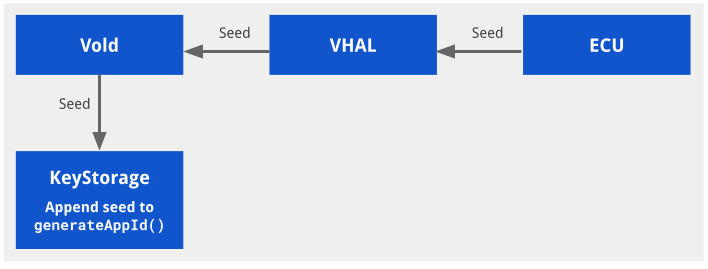 वाहन के लिए वेंडर की ओर से उपलब्ध कराए गए एचएएल में STORAGE_ENCRYPTION_BINDING_SEED प्रॉपर्टी का इस्तेमाल करके, यह सुविधा चालू की जाती है. इस प्रॉपर्टी में 16 बाइट की बाइट स्ट्रिंग होती है. साथ ही, यह उम्मीद की जाती है कि इसे IVI से अलग ईसीयू पर सेव किया जाएगा. इस प्रॉपर्टी को शुरुआत में Android Automotive OS (AAOS) सेट करता है. यह क्रिप्टोग्राफ़िक तरीके से सुरक्षित रैंडम नंबर जनरेटर (CSRNG) का इस्तेमाल करके इसे जनरेट करता है. इसके बाद, AAOS अगले बूट पर प्रॉपर्टी को पढ़ता है.