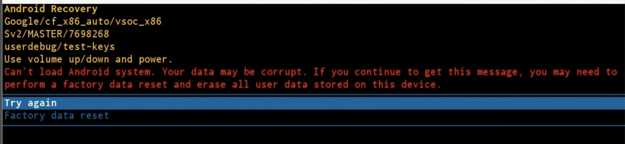 अगर ईसीयू का बीज डेटा मेल नहीं खाता है, तो डिवाइस रिकवरी मोड में रीबूट हो जाता है. साथ ही, उपयोगकर्ता को /data पार्टीशन मिटाने या फिर से कोशिश करने के लिए कहा जाता है.