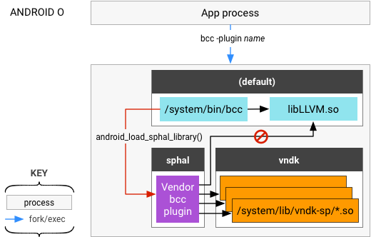 This restriction is enforced by loading the bcc plugin into the sphal namespace using the android_sphal_load_library() function. In previous versions of Android, the plugin name was specified using the -load option and the lib was loaded using the simple dlopen() by libLLVM.so. In Android 8.0 and higher, this is specified in the -plugin option and the lib is directly loaded by the bcc itself. This option enables a non-Android-specific path to the open source LLVM project.