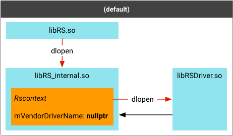The RS HAL implementation from the vendor is not used at all when the CPU fallback path is taken, and an RsContext object is created with null mVendorDriverName. libRSDriver.so is (by default) dlopened and the driver lib is loaded from the default namespace because the caller (libRS_internal.so) is also loaded in the default namespace.