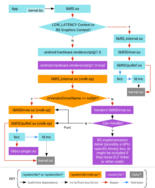 • Vendor code (RS HAL, RS driver, and the bcc plugin) are linked against the RenderScript internal libs located at /system/lib/vndk-sp. They cannot link against libs in /system/lib because libs in that directory are built for the platform and thus may not be compatible with the vendor code (i.e., symbols may be removed). Doing so would make a framework-only OTA impossible.
