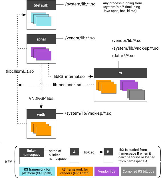On a device running Android 8.0 and higher, all Same-Process HALs (SP-HALs) except RenderScript are loaded inside the linker namespace sphal. RenderScript is loaded into the RenderScript-specific namespace rs, a location that enables a slightly looser enforcement for RenderScript libs. Because the RS implementation needs to load the compiled bitcode, /data/*/*.so is added to the path of the rs namespace (other SP-HALs are not allowed to load libs from the data partition).