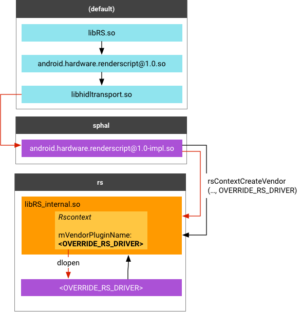 libRSDriver.so จะdlopen (โดยค่าเริ่มต้น) และโหลดไลบรารีไดรเวอร์จากเนมสเปซ default เนื่องจากโหลดโปรแกรมเรียกใช้ (libRS_internal.so) ในเนมสเปซ default ด้วย
