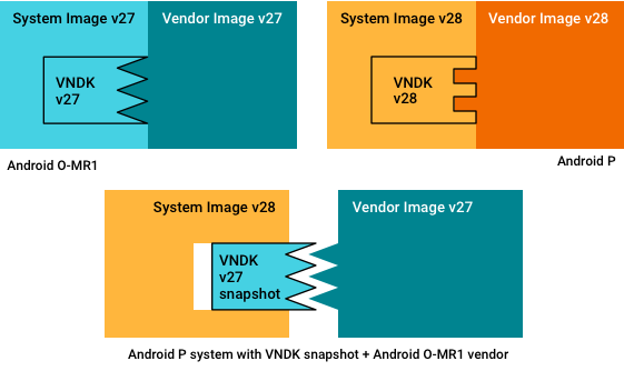 Starting in Android 9, new versions of Android will include at least one snapshot of VNDK-core and VNDK-SP directories for older versions in the Android source code. At build time, required snapshots will be installed to /system/lib[64]/vndk-${VER} and /system/lib[64]/vndk-sp-${VER} (directories that can be used by the vendor partition), where ${VER} is the string variable that represents the version name of the VNDK snapshot.