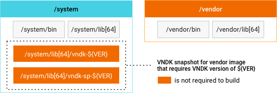 باید عکس فوری VNDK و فایل های پیکربندی فضای نام پیوند دهنده برای تصویر فروشنده در تصویر سیستم باشد. فایلهای پیکربندی فضای نام پیوند دهنده بهطور خودکار برای جستجوی کتابخانههای VNDK در /system/lib[64]/vndk-${VER}