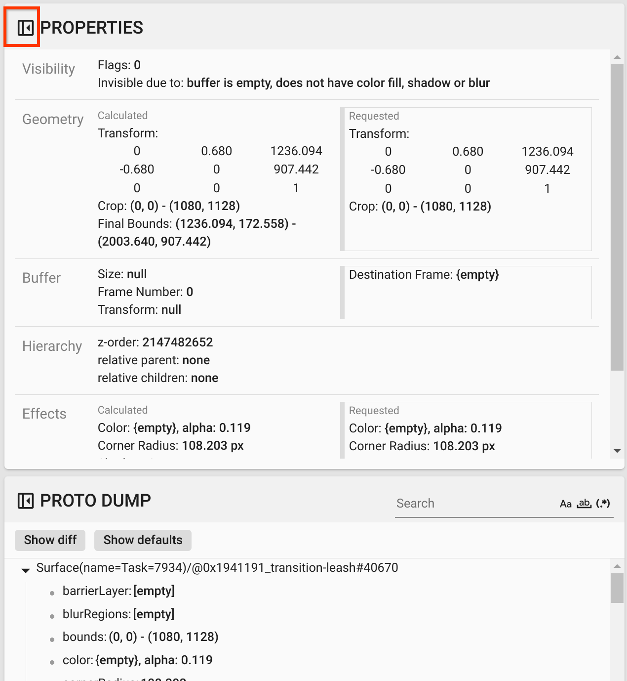 12. 在階層檢視中取消選取「Flat」,顯示整個階層樹狀結構,然後前往應用程式介面的父節點,直到「Calculated」和「Requested」轉換相同為止,顯示在 Surface(name=Task=7934)/@0x1941191_transition-leash#40670 介面上要求的轉換。
