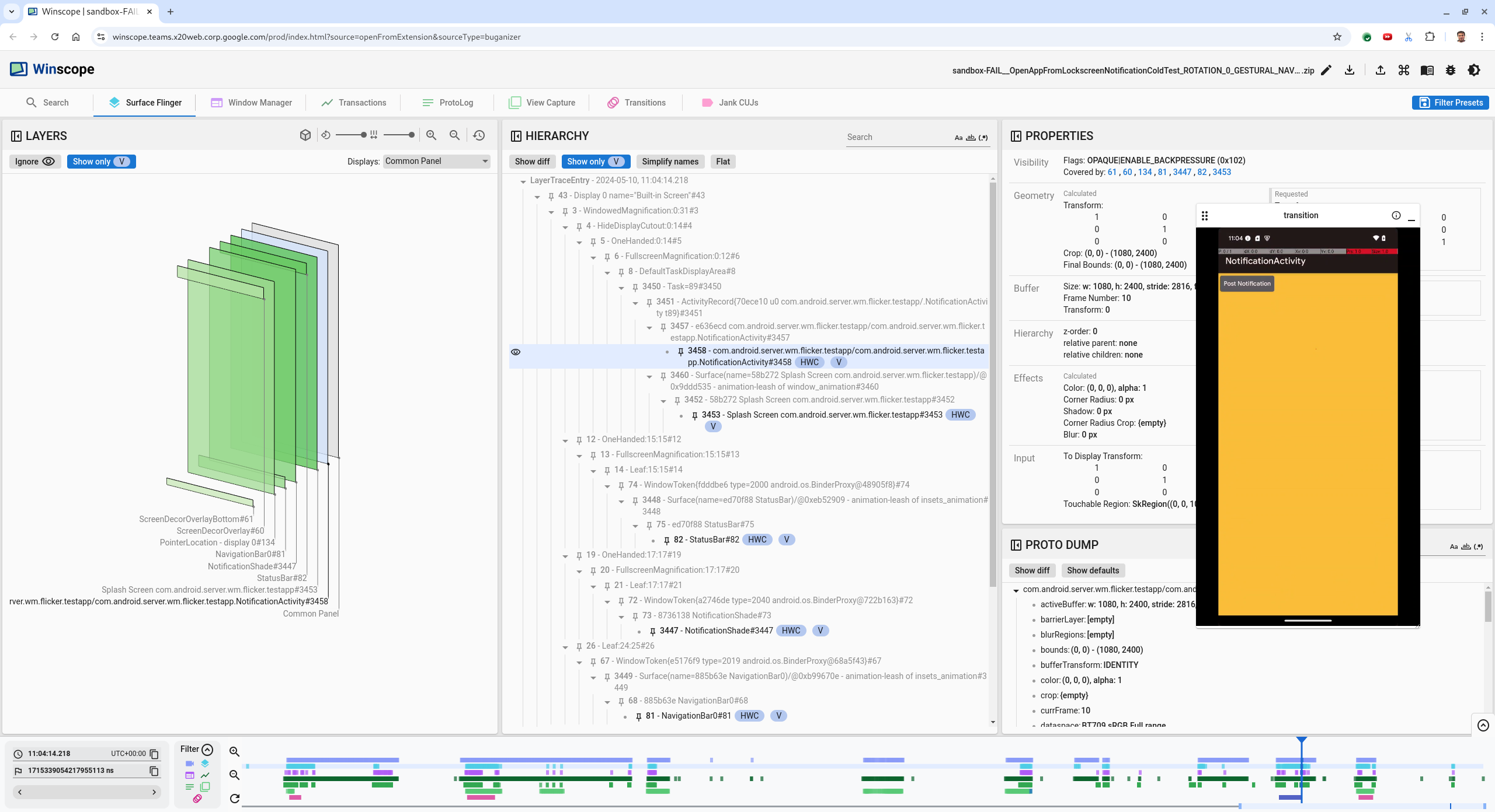 يوضّح هذا المثال كيفية استخدام Winscope لتصحيح خطأ في اختبار التذبذب.