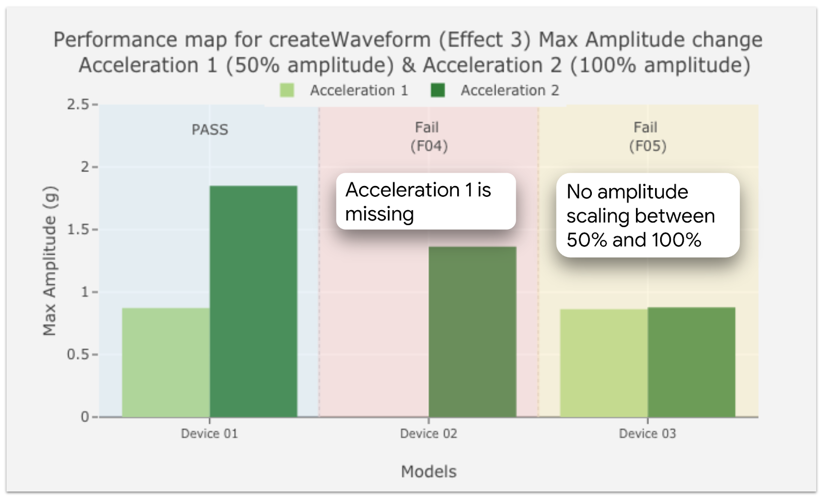 빨간색 점선은 최소 진폭 기준점을 나타냅니다. 진폭이 0.1g보다 약하면 사용자가 햅틱을 인식할 수 없습니다 (실패 사례 F03-2).