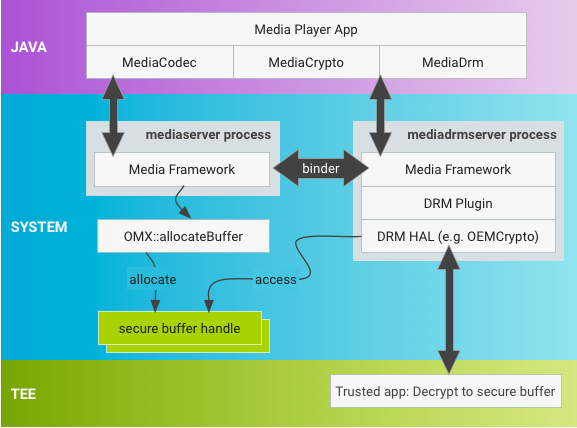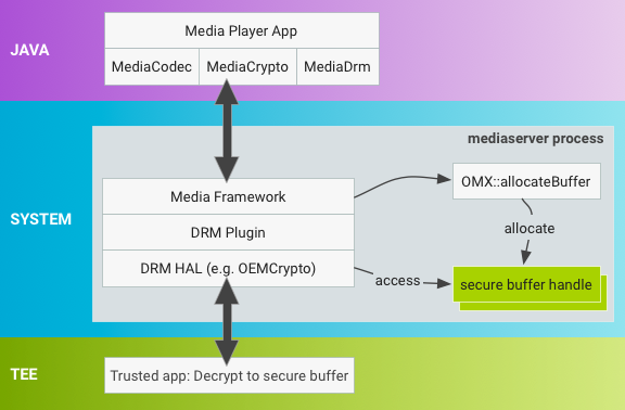 O servidor DRM é usado ao reproduzir conteúdo protegido por DRM, como filmes no Google Play Filmes. Ele processa a descriptografia dos dados criptografados de maneira segura e, portanto, tem acesso ao armazenamento de certificados e chaves e a outros componentes sensíveis. Devido a dependências do fornecedor, o processo de DRM ainda não é usado em todos os casos.