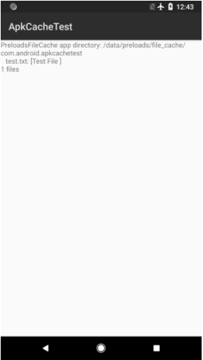 adb shell mkdir -p /data/preloads/file_cache/com.android.apkcachetestadb shell restorecon -r /data/preloadsadb shell "echo "Test File" > /data/preloads/file_cache/com.android.apkcachetest/test.txt" - Test the app. After installing the app and creating test