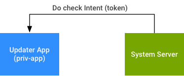 - Le processus du serveur système déclenche une vérification des mises à jour en diffusant une intention ciblée avec un jeton unique à usage unique à l'application Updater. Le serveur système conserve la trace du jeton le plus récent qu'il a généré afin de pouvoir déterminer quand la vérification la plus récente qu'il a déclenchée est terminée. Tous les autres jetons sont ignorés.