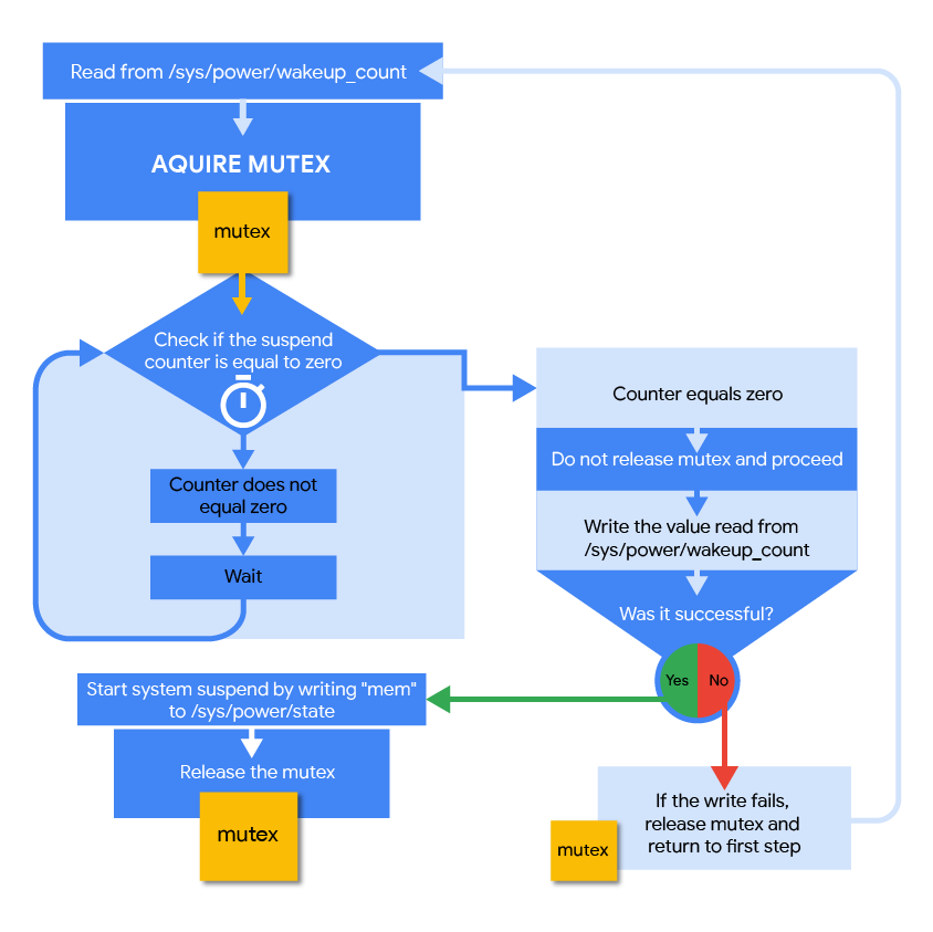 /sys/power /wakeup_count에서 읽은 값을 이 파일에 씁니다. 쓰기에 실패하면 루프의 처음으로 돌아갑니다. mem을/sys/power/state에 써서 시스템 정지를 시작합니다.- 뮤텍스를 해제합니다.