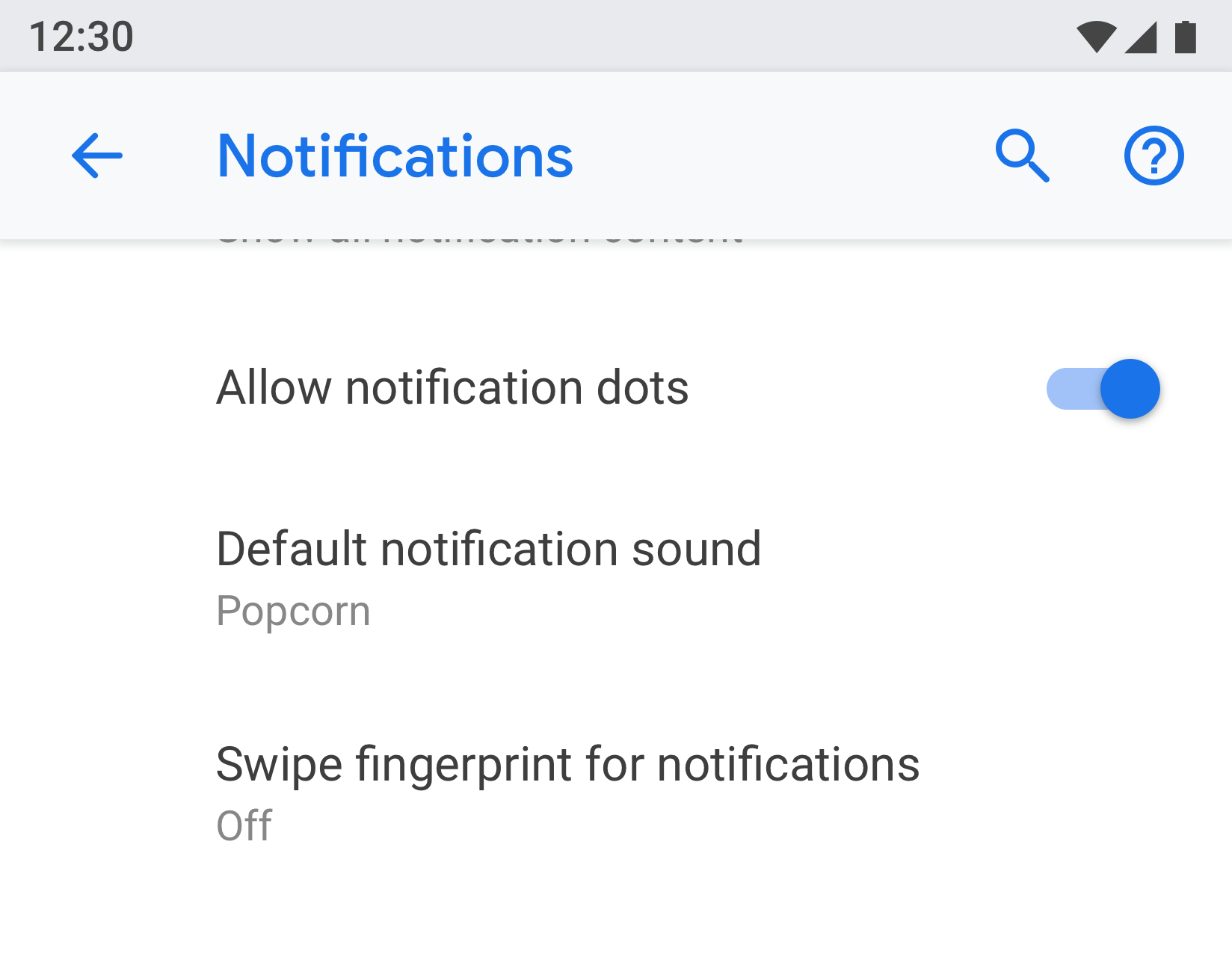 1 つの画面に多数の設定を表示する場合は、グループ化して分割線で区切ることができます。以前の Android バージョンとは異なり、分割線は個々の設定を区切るのではなく、グループ内の設定をクラスタ化するために使用されます。