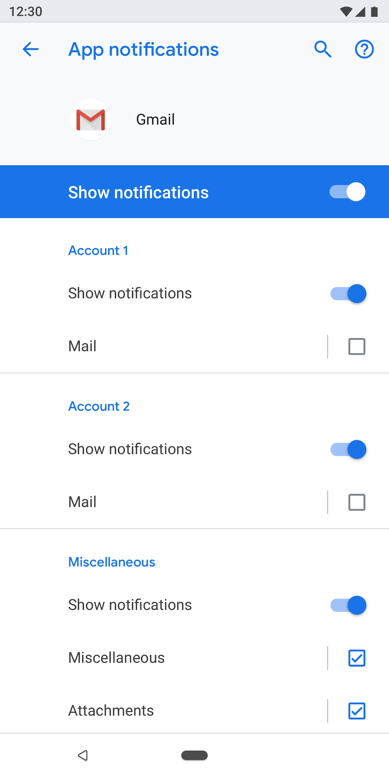 그림 9. 앱 알림 화면에서 사용하는 마스터 설정의 예: 마스터 전환 스위치를 끄면 이 앱의 전체 기능이 사용 중지됨