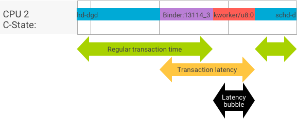 Dalam transaksi yang sempurna, saat proses klien dan server beralih secara lancar, pengujian throughput dan latensi tidak menghasilkan pesan yang sangat berbeda. Namun, saat kernel OS menangani permintaan interupsi (IRQ) dari hardware, menunggu kunci, atau hanya memilih untuk tidak segera menangani pesan, gelembung latensi dapat terbentuk.