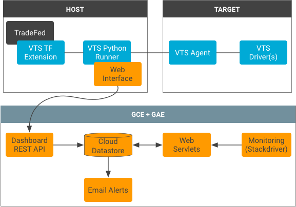 Los resultados del estado de la prueba se suben de forma continua a la base de datos de Cloud Datastore mediante una interfaz REST. El ejecutor de VTS procesa los resultados automáticamente y los serializa con el formato Protobuf.